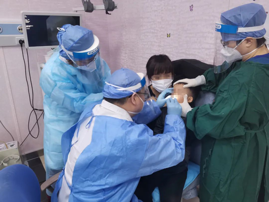 耳鼻喉科,是呼吸道接触的重点防护科室。新冠病毒感染可表现为鼻、咽部症状,耳鼻喉科检查时易与患儿发生飞沫接触,所以从疫情出现以来,耳鼻喉科医护人员的防护措施极为严格。诊室前移,设置流调筛查区,患儿到院第一时间可筛查、判断是否为急危重患儿。非急危重症患儿,需要持48小时核酸阴性证明以及就诊时抗原检测阴性结果就诊。急危重症患儿就地抢救。在院感防控方面,医护人员二级防护,面对高危人群时采取三级防护。一人一诊、一患一陪护,加强消杀消毒,把交叉感染风险降至最低。院感防控、医疗救治,耳鼻喉科皆尽心尽力,两手抓、两不误。