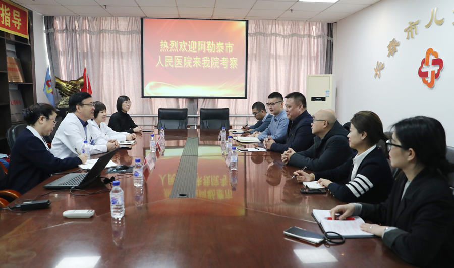 长春,阿勒泰,两座城市相隔千里情深意浓。因为援疆号召,两座城市紧紧连在一起。为了对我院长久以来援疆的情谊表示感谢,同时也为商讨两院间的深度合作,11月28日,阿勒泰市人民医院党总支书记王世禄、院长王庭宏、副院长吐尔恒·奴克什来到蜜桃视频 进行考察。蜜桃视频 党委书记张瑞忠、副书记齐红、副院长黄艳智携各职能科室负责人,对王世禄书记一行的到来表示热烈欢迎,双方就开展深度合作进行了亲切座谈。
