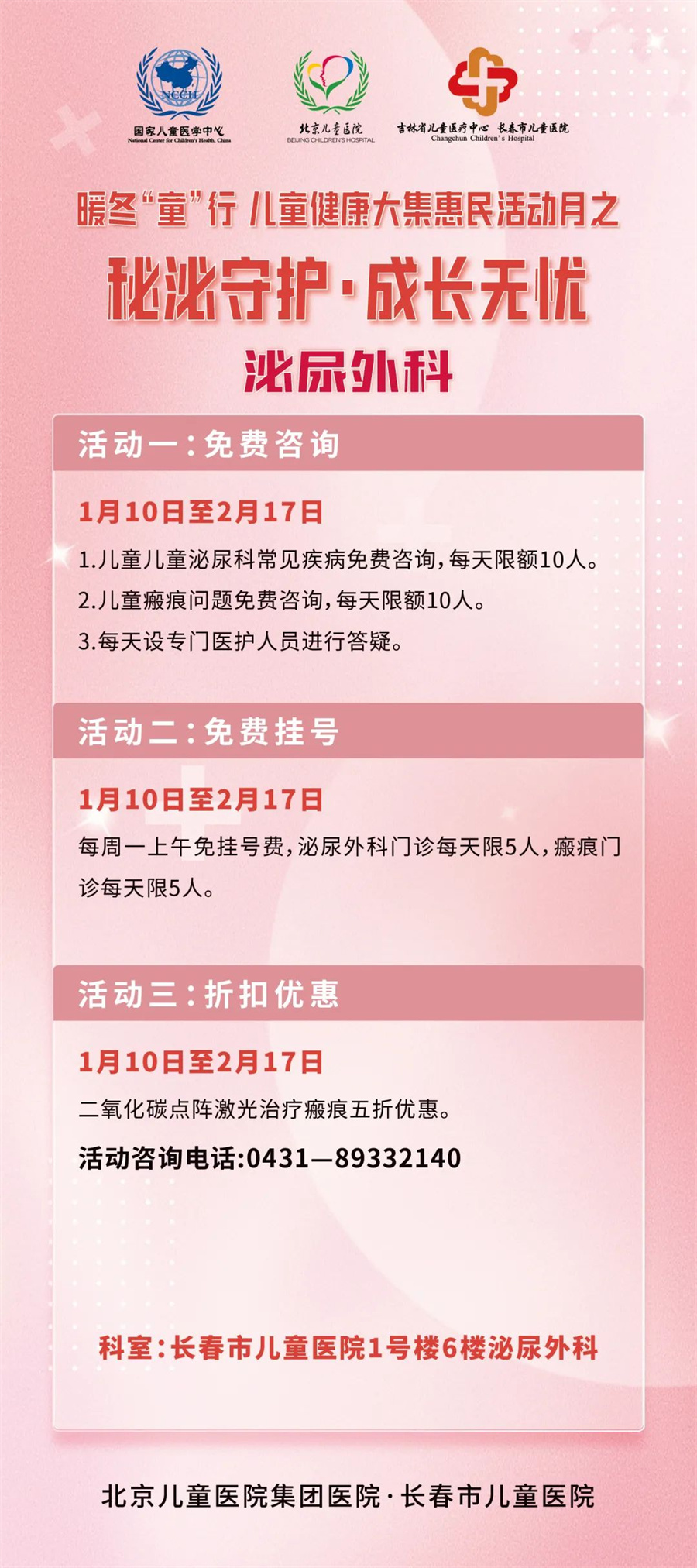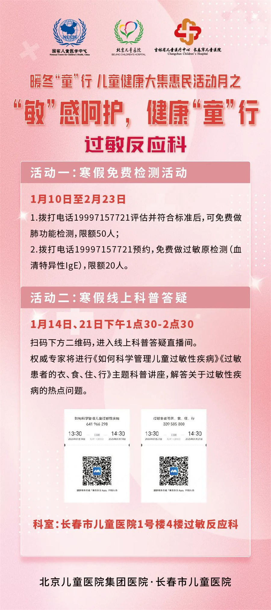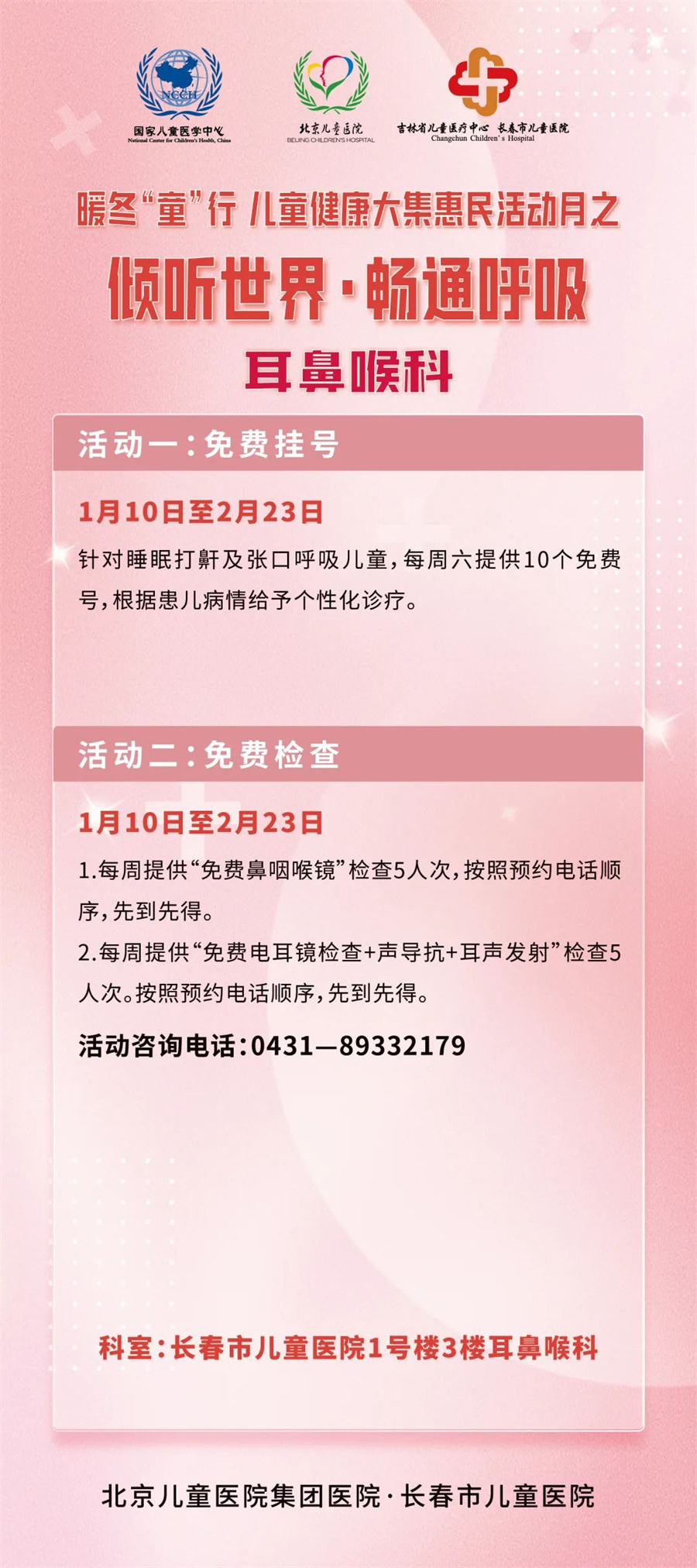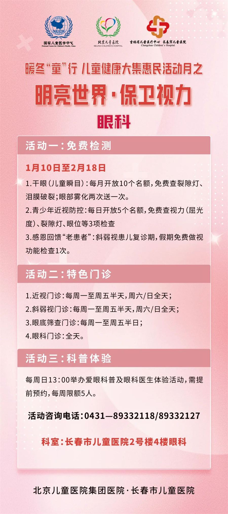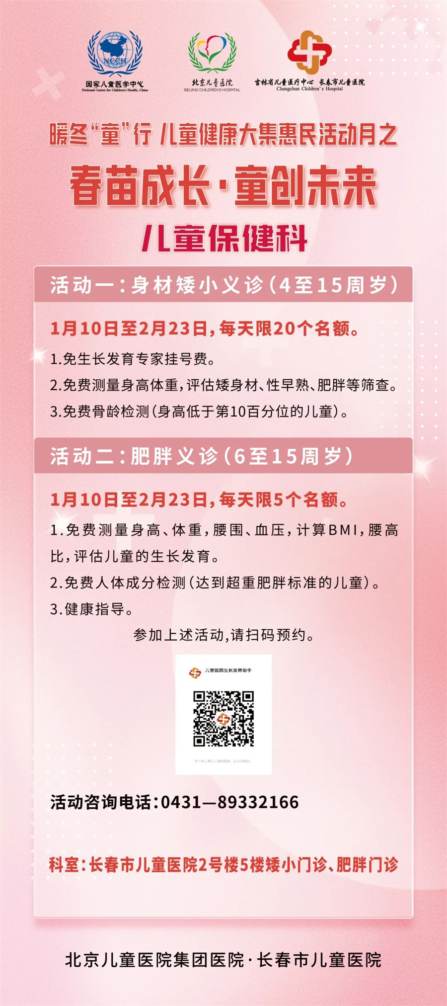 惠民活动月从1月10日开启,至2月28日结束,期间开展三项大活动及若干项小活动。一是开展北京专家多学科大型义诊;二是成立儿童冰雪健康护卫队;三是启动由过敏反应科、眼科、口腔科、耳鼻喉科、发育行为心理科、儿保科、骨科、泌尿外科联合参与的寒假义诊惠民活动。