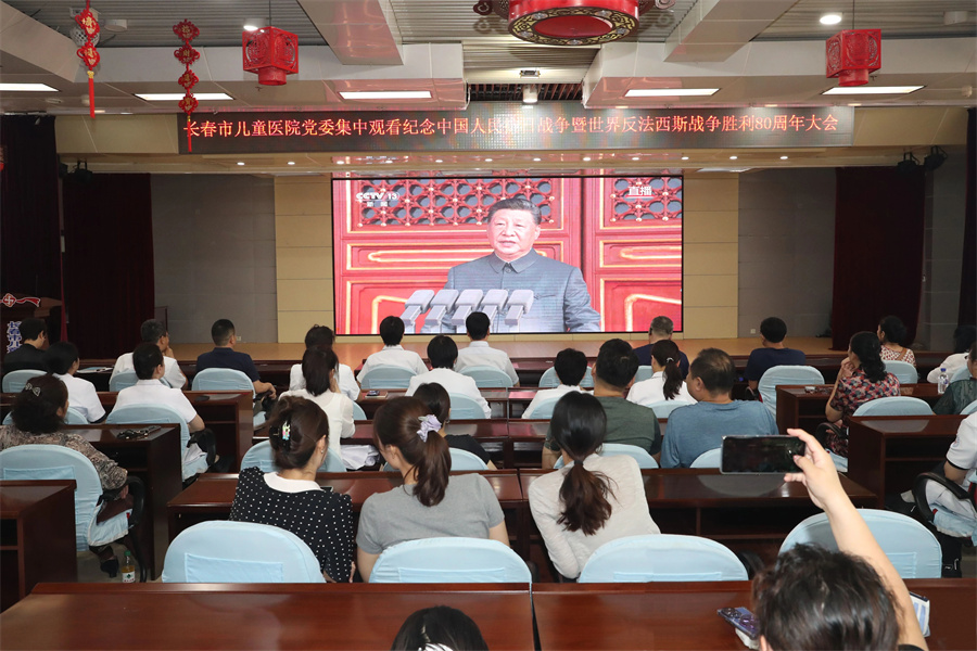 北京儿童医院集团医院·蜜桃视频 党委办公室精心组织全院职工、患者及家属观看直播盛况,真切感受新时代国家发展成就与国防力量建设成果,深刻体悟这场伟大胜利对实现中华民族伟大复兴与维护世界和平的重大意义。医院理论学习中心组集中学习,汲取伟大爱国精神和伟大抗战精神的智慧和力量。9时,院领导班子成员、机关后勤干部职工及20余名退休老党员、老职工整齐就座。