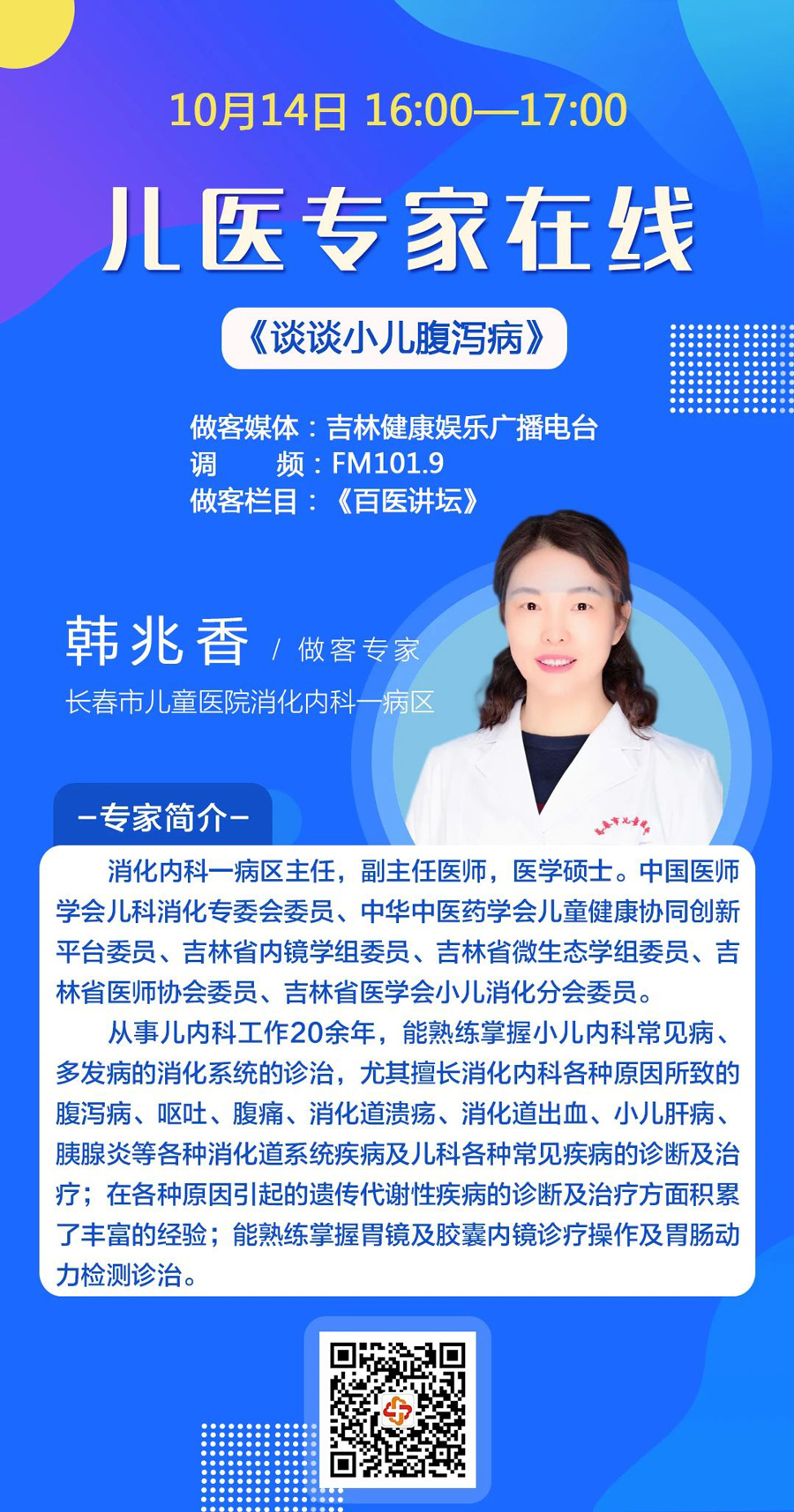 消化好坏关系到营养供给是否充足,直接影响人体健康,因此,小儿消化道疾病倍受家长关注。10月14日、15日16:00—17:00,蜜桃视频 消化内科一病区主任韩兆香将做客吉林健康娱乐广播电台《百医讲坛》栏目,详细讲解小儿消化性溃疡和小儿腹泻,请家长届时收听。