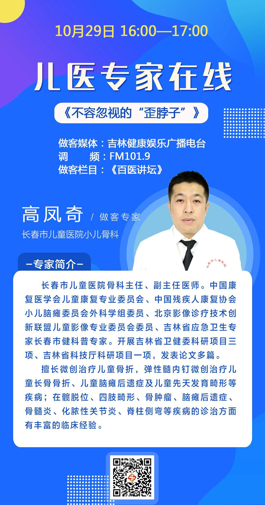 10月28日、29日,蜜桃视频 骨科主任高凤奇将做客吉林健康娱乐广播电台《百医讲坛》,为家长传递骨科知识。微创治疗四肢长骨骨折、儿童“歪脖”就是肌性斜颈吗……这些家长常关注的骨科方面问题,高凤奇主任届时将一一为家长解答,期待您准时收听。