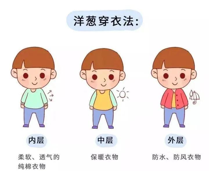 日常生活中家长一定要关注天气状况,及时帮孩子加减衣服。建议孩子“洋葱式穿法”,给宝宝多穿几层衣物,外层尽量选择宽松、防风的外套;内层可选择透气且排汗功能良好的纯棉衣物。宝宝的基础代谢率比大人高,所以,他们可以比大人少穿一件衣服。