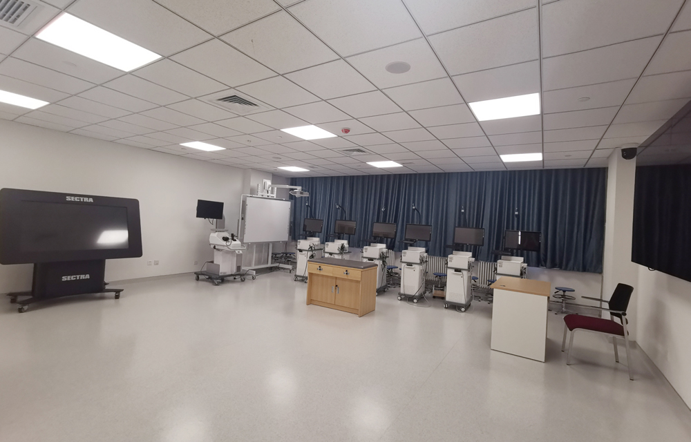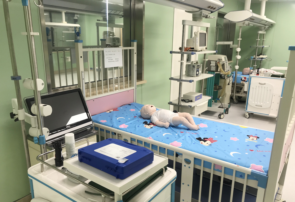 临床实践技能培训中心教学设备齐全,培训场地空间独立。建筑面积约2300多平方米,设置有体格检查室、儿内科基础技能室、儿外科基础技能室、护理技能室、AHA急救技能培训室、多媒体教室、临床思维训练室、研究生授课室/备课室、模拟ICU病房、动物手术室、10个考站等,配备了高仿真综合模拟婴儿(瑞恩)、高仿真综合模拟儿童(彼得)、实时3D重建解剖影像及手术计划训练系统、腹腔镜虚拟训练系统、临床思维训系统等。