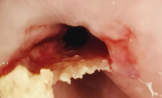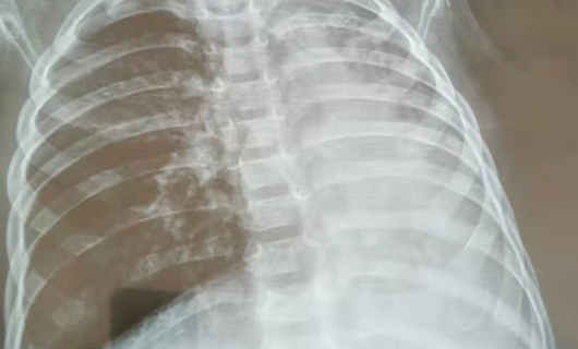 29个月的贝贝(化名)来院时发热2天,喘憋1天,脸色发紫。医生听诊发现,贝贝左肺几乎没有呼吸音,肺CT检查发现左肺完全不张。内镜下,边鹏确诊贝贝为塑型性支气管炎,左肺已堵满。