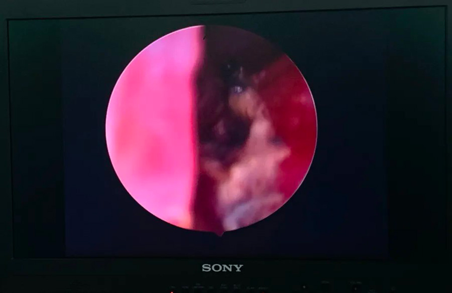 3月23日,120急救车将1名患儿送至蜜桃视频 。患儿3岁,来时明显看出鼻子不舒服。妈妈说,前一天儿子把纽扣电池塞右侧鼻子里了,但在当地医院没取出来。如果真的是纽扣电池,那就危险了,因为电池产生的腐蚀性物质及微电流会造成鼻腔黏膜腐蚀伤,甚至后期可能出现鼻中隔穿孔。门诊医生接诊后,未能看到鼻道中有明显异物,耳鼻喉科开放急危重症绿色通道。由于患儿及家长核酸结果未回报,耳鼻喉科医生在三级防护下做了鼻咽镜检查。在患儿下鼻道底部,发现有黏膜肿胀以及典型的纽扣电池异物放电导致的“冒泡”现象,但异物被肿胀的黏膜包裹,大小及形态显示不清。鼻咽部平片同样显示鼻腔底部有圆形金属异物。