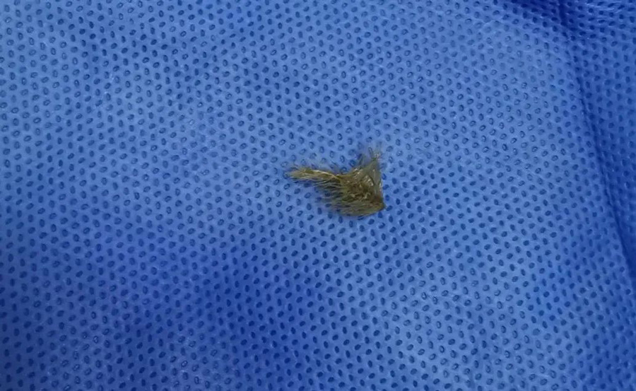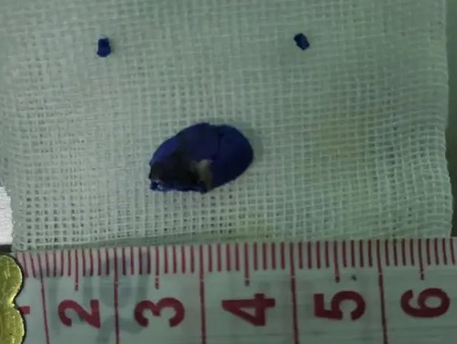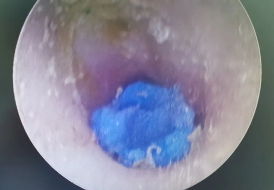 经过流调、采集核酸样本和抗原后,妈妈带着儿子进入医院。由于异物位置接近鼓膜,孩子太小,难以配合耳道异物取出,所以李莉萍在急诊为其进行了全麻下耳道异物取出。几分钟后,一块蓝色彩泥被取出来了。由于患儿自行抠取行为,导致耳道壁红肿,鼓膜充血,幸好没有穿孔。