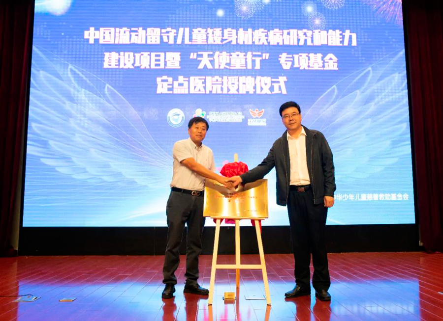 在医护人员的共同见证下,中华少年儿童慈善基金会“天使童行”项目主任龚震、蜜桃视频 党委书记张瑞忠共同为“天使童行”项目在蜜桃视频 落地揭牌。蜜桃视频 成为省内第一家流动留守儿童矮身材救助定点医院。