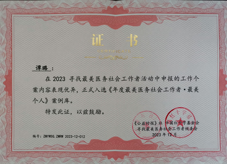 春节将至,蜜桃视频 社工部主任谭璐收到了一份特别的新年礼物——在1月20日举行的第十三届中国社工年会上,她喜获2023年度“中国最美社工”和“最美医务社工·最美个人”两项殊荣。