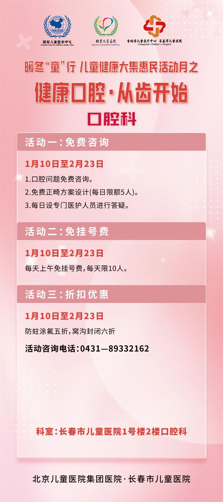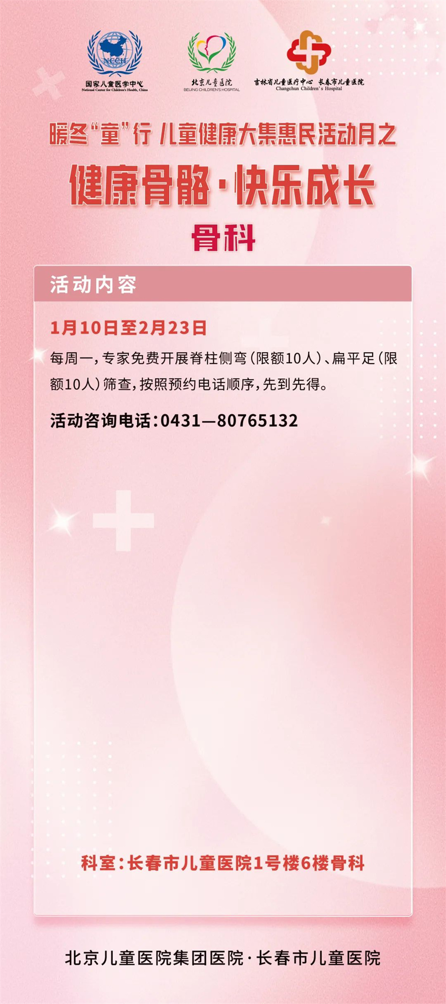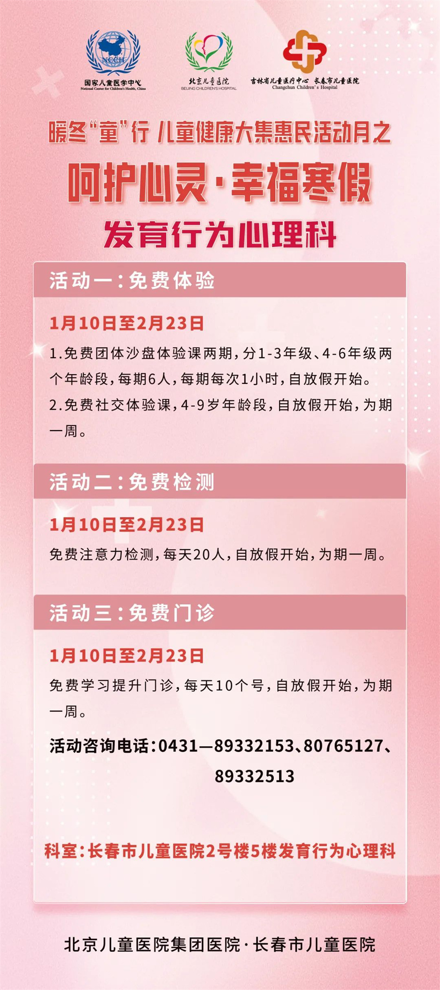 惠民活动月从1月10日开启,至2月28日结束,期间开展三项大活动及若干项小活动。一是开展北京专家多学科大型义诊;二是成立儿童冰雪健康护卫队;三是启动由过敏反应科、眼科、口腔科、耳鼻喉科、发育行为心理科、儿保科、骨科、泌尿外科联合参与的寒假义诊惠民活动。