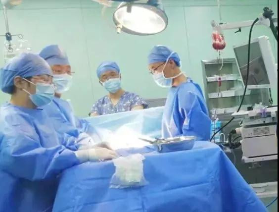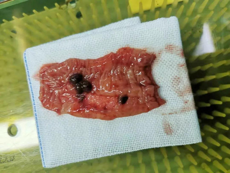 出血点范围探查到了,需要开腹探查准确位置,进一步手术治疗。麻醉师、手术室护士一一就位,密切配合。手术由普外科主任崔钊主刀,术中他反复仔细探查,不放过任何一个可能。时间在一点点流逝,手术室外的家长在煎熬,手术室内儿医团队在努力奋战。经过反复多次探查,终于,无影灯下,那薄薄的肠壁内膜上显现出隐匿的出血点。崔钊主任实施肠切除肠吻合手术,切除息肉。