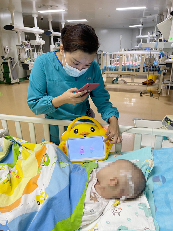 “小盼盼,爸爸妈妈可以通过这个视频看到你呦!”看到护士拿着手机拍摄,盼盼不时地用可爱的表情予以回应。“孩子患病初期,我整宿睡不着。通过监护探视云平台,每天都能看到孩子,我的焦虑也缓解了不少。”盼盼妈妈说,与女儿云端见面,成为她每天的期待。