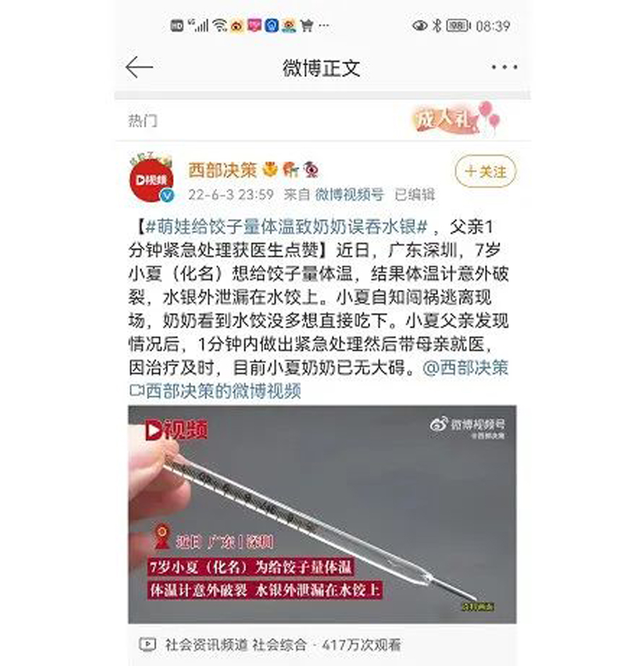 6月初,出现在微博热搜的这则事件引起很多人的关注。水银温度计对于每个有宝宝的家庭来说,再平常不过了。水银有毒,一旦泄漏或被误服,正确处置非常关键。在此,蜜桃视频 内镜中心副主任边鹏教您正确处置方法,要仔细看哦!