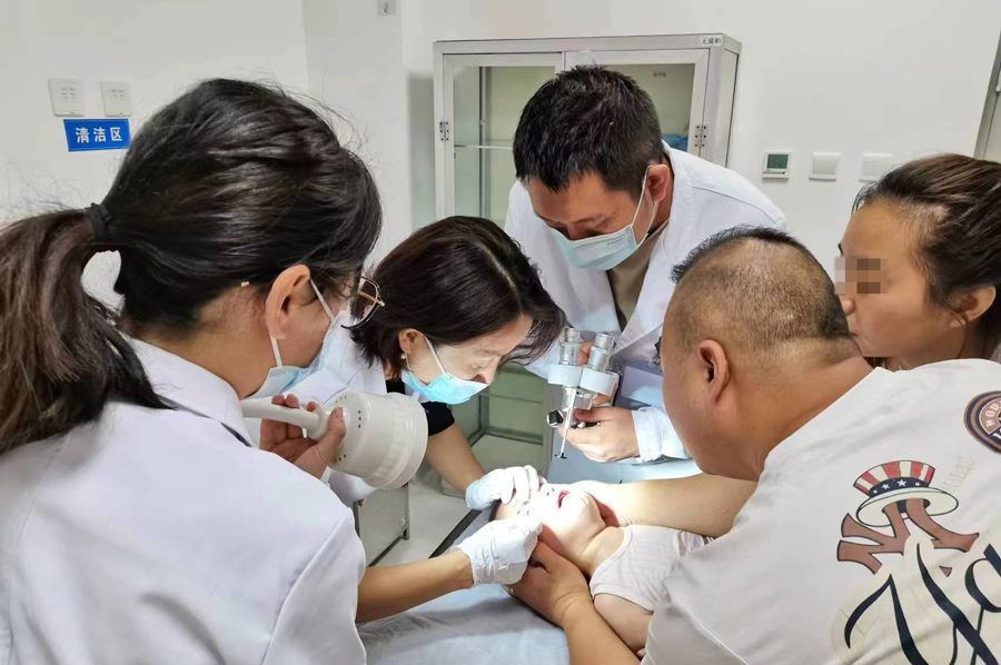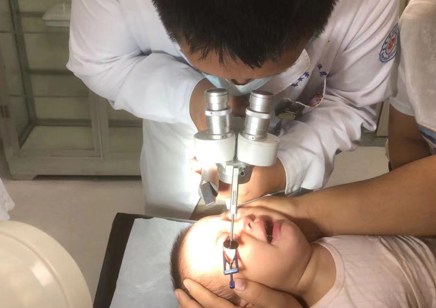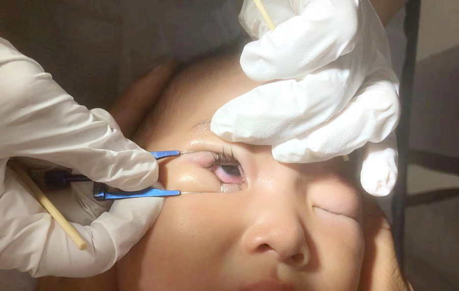 病例分析:不久前,延边地区2岁的童童(化名)突然出现右眼红、流泪、畏光等症状,家长观察2天,右眼不但红还开始肿起来了,这才着急了,赶紧带童童去看医生。家长本以为是简单的治疗,却不想开始了漫长的求医路。家长带童童辗转延边和长春10余家医院,都因为孩子眼部疼痛,哭闹得厉害,不能配合检查。医生无奈,只能按照结膜炎给童童用抗生素眼药水及润眼药物点眼。但各种用药持续了近1个月,童童的病情不但没有缓解,反而逐渐加重,出现右眼肿胀,无法睁眼状态。家长焦急万分,抱着最后的希望,9月11日,家人带童童来到蜜桃视频 。在眼科门诊,童童仍然特别抗拒医生,眼科副主任李娅娜接诊后不慌不忙,还安抚家长道:“我们儿童医院每天都面临不同的孩子,孩子和成人不一样,生病的时候会更害怕,紧张、易怒、不配合检查,别着急,慢慢来。等孩子情绪稳定,我们能准确检查了,才能对疾病做出正确判断,给出正确的用药。”李娅娜副主任一边微笑着和童童互动,一边和家长仔细了解近1个月就诊情况,评估病情。一会儿,孩子的情绪终于慢慢放松下来,也不再恐惧,答应配合医生的检查。医生使用儿童型开睑器,轻柔地撑开童童的眼睑,快速、准确地进行充分检查。在手持裂隙灯下,医生发现童童右眼角膜有一个溃疡灶,溃疡深度达0.3mm以上,面积较大,波及1/3角膜,部分位于瞳孔区,如果不及时控制病情,很可能会影响视力,严重了还可能造成角膜穿孔,导致失明。听了医生的病情分析,家长担心极了,但也很庆幸来到这里,终于明确了孩子病情。